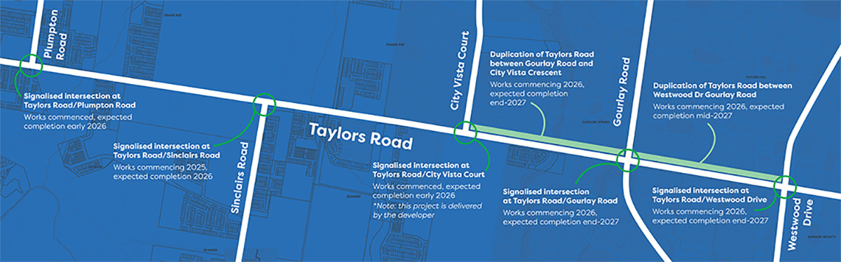 - Duplication of Taylors Road, with an additional lane between Gourlay Road and City Vista Court