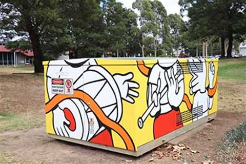 The Indian Service Club community helps members to live and share happiness together. This work is inspired by Indian dancing, an easily shared source of joy in the community, which can break down language barriers. It depicts characters dancing, playing music and enjoying their life together. Hands feature heavily in 2choey’s designs - especially the use of hands as heads. The hot colour shades like red, orange and yellow are reminiscent of the heat and colour in India - especially evident in Indian clothes and foods. All sides of the design connect without a beginning or end, showing that everyone in the group is connecting with each other.