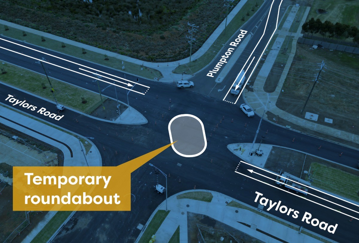 Taylors Road and Plumpton Road intersection, Fraser Rise Council is installing traffic lights at the intersection of Taylors Road and Plumpton Road. The intersection is operating with a temporary roundabout, 40km speed limit with one lane in each direction with temporary barriers until the traffic lights can be energised in mid-2026.Click to see intersection treatment.